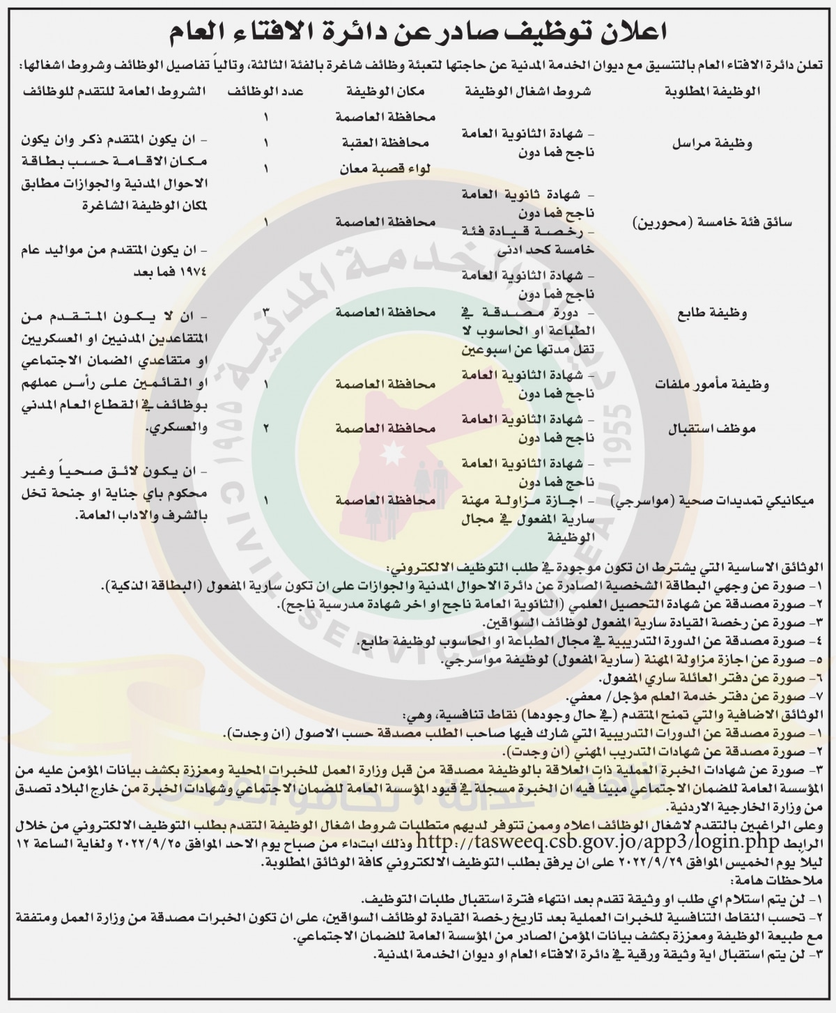 اعلان وظائف شاغرة صادر عن دائرة الافتاء العام