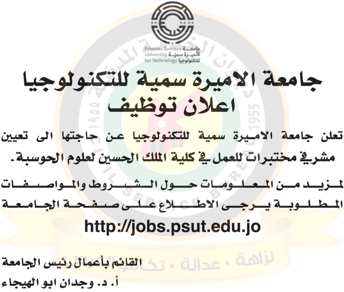 22 الاعلامي- اعلان توفر شواغر صادر عن جامعة الاميرة سمية للتكنولوجيا