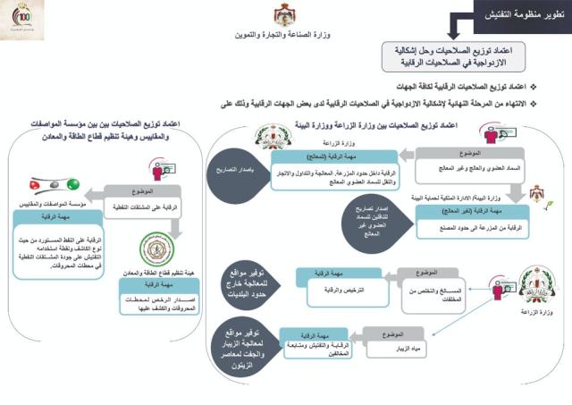 وأكدت الوزارة انتهاء المرحلة النهائية للحدّ من إشكالية الازدواجية في صلاحيات الجهات الرقابية؛ إذ تمّ اعتماد توزيع الصلاحيات بين كل من وزارتي الزراعة والبيئة فيما يتعلّق بالأسمدة العضوية، والمسالخ والتخلّص من المخلفات، ومياه الزيبار، بالإضافة إلى اعتماد توزيع الصلاحيات بين مؤسسة المواصفات والمقاييس وهيئة قطاع الطاقة والمعادن فيما يتعلّق بالرقابة على المشتقات النفطية، وإصدار الرّخص لمحطات المحروقات والكشف عليها.