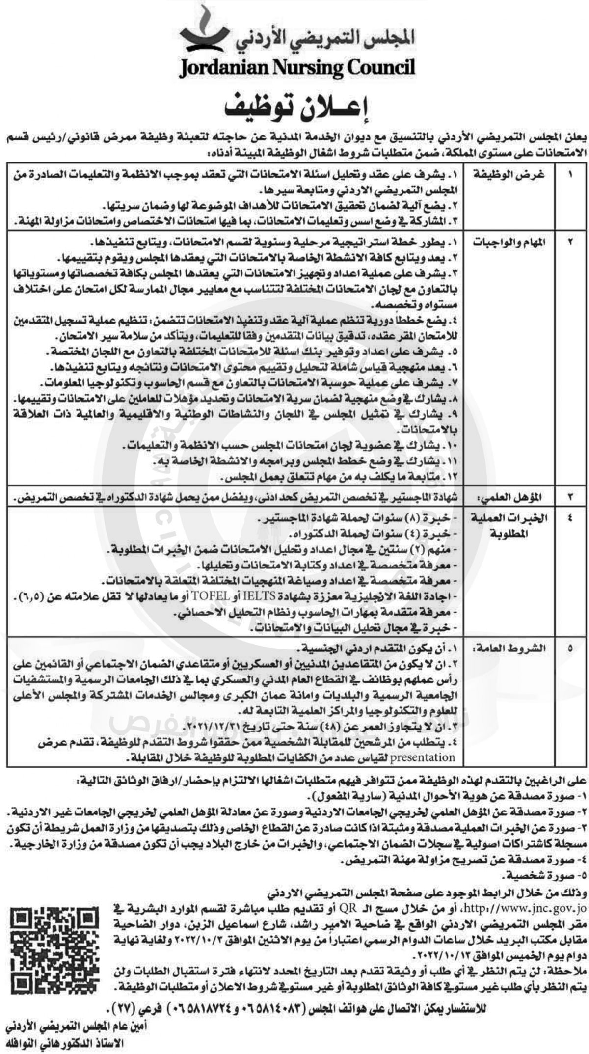22 الاعلامي- اعلان عن توفر وظيفة شاغرة ممرض قانوني / رئيس قسم الامتحانات على مستوى المملكة صادر عن المجلس التمريضي الاردني وبالتنسيق مع ديوان الخدمة المدنية