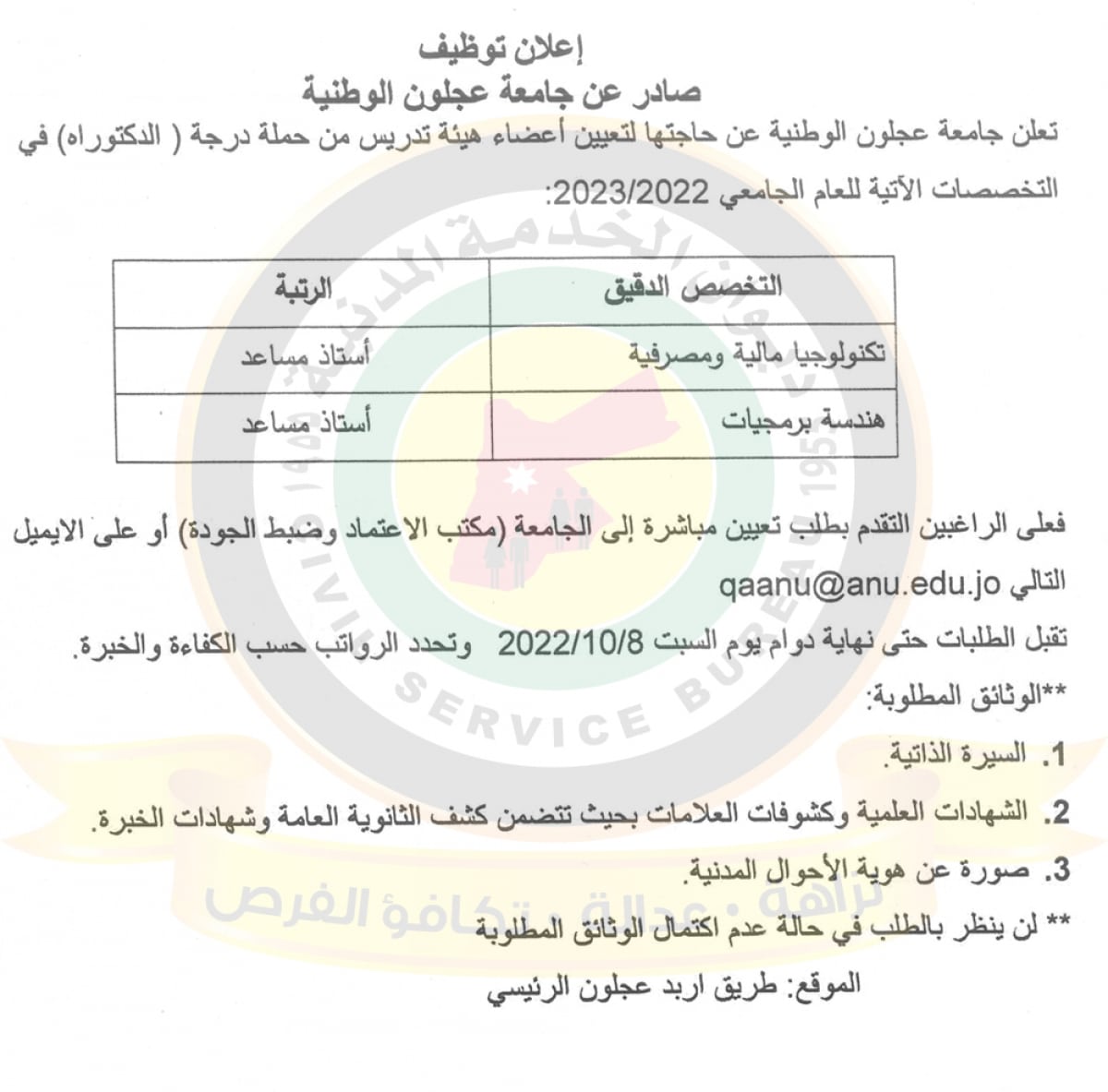 22 الاعلامي- اعلان وظائف شاغرة لتعيين أعضاء هيئة تدريس صادر عن جامعة عجلون الوطنية