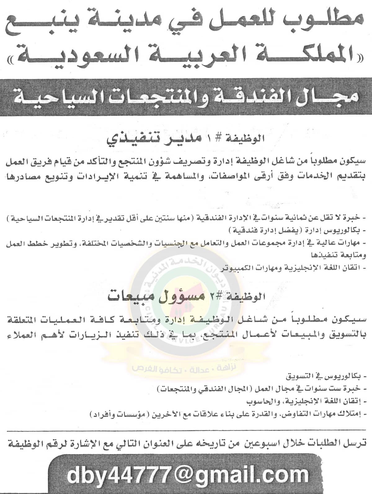 22 الاعلامي- إعلان عن توفر وظائف شاغرة للعمل في مدينة ينبع "المملكة العربية السعودية" في مجال الفندقة والمنتجعات السياحية