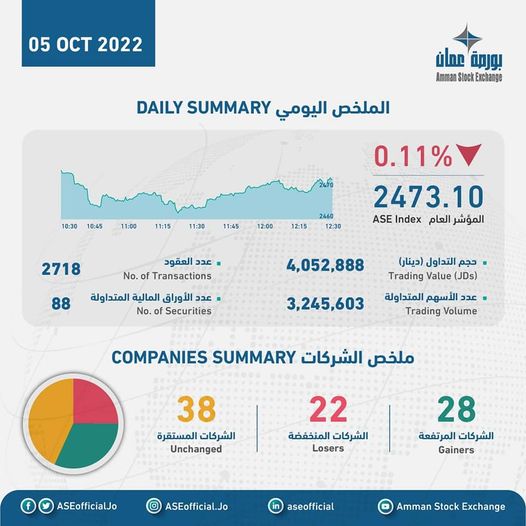 22 الإعلامي- بلغ حجم التداول الإجمالي ليوم الأربعاء 05/10/2022 حوالي (4.1) مليون دينار وعدد الأسهم المتداولة (3.2) مليون سهم، نفذت من خلال (2,717) عقداً.