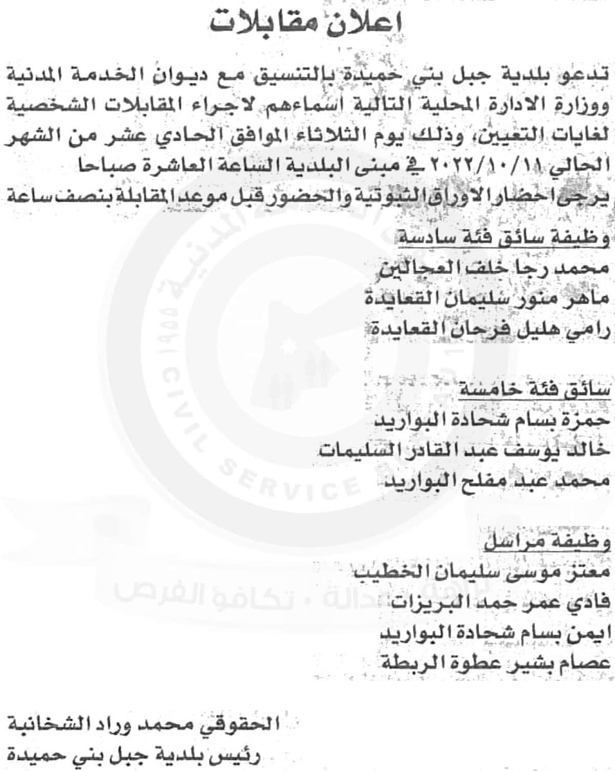 22 الاعلامي- اعلان موعد اجراء المقابلات الشخصية صادر عن بلدية جبل بني حميدة وبالتنسيق مع ديوان الخدمة المدنية