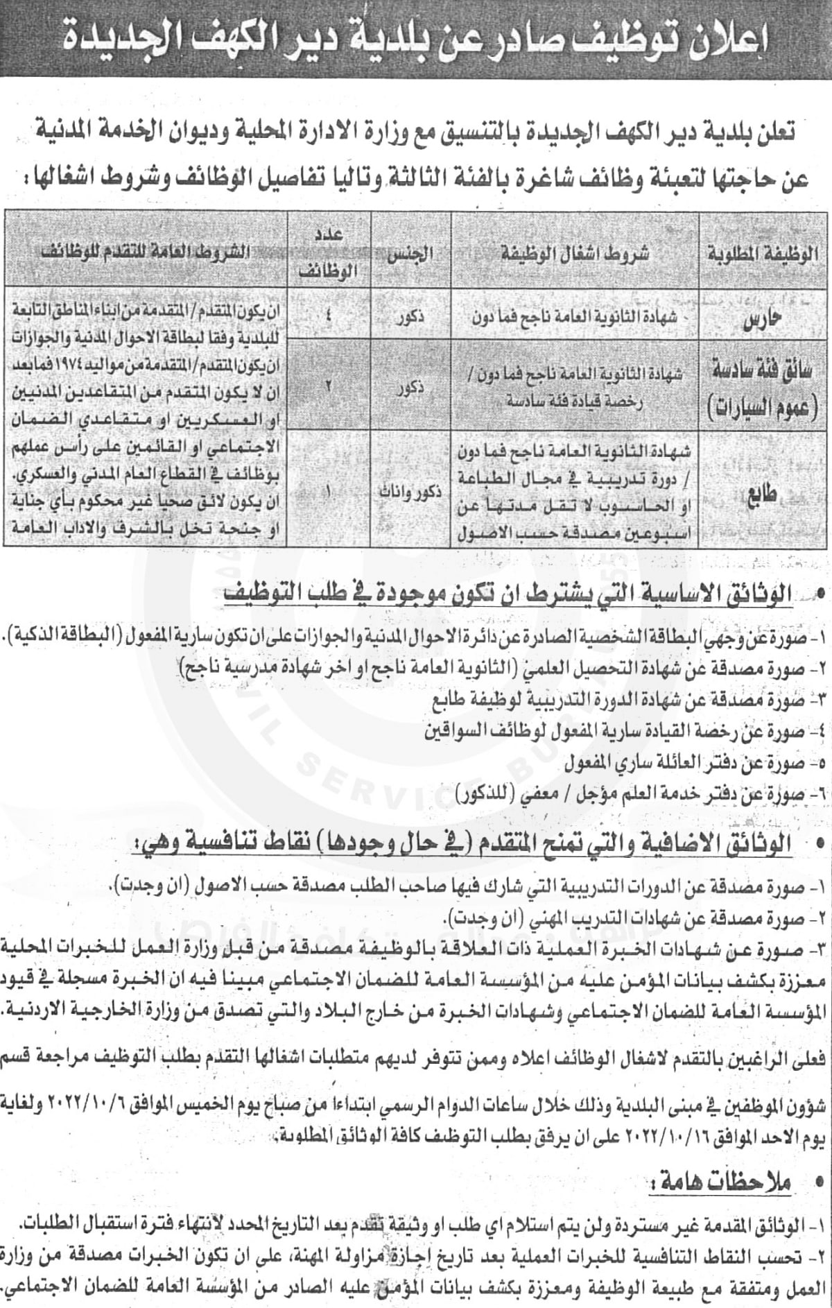 22 الاعلامي- اعلان عن توفر وظائف شاغرة في الفئة الثالثة صادر عن بلدية دير الكهف الجديدة