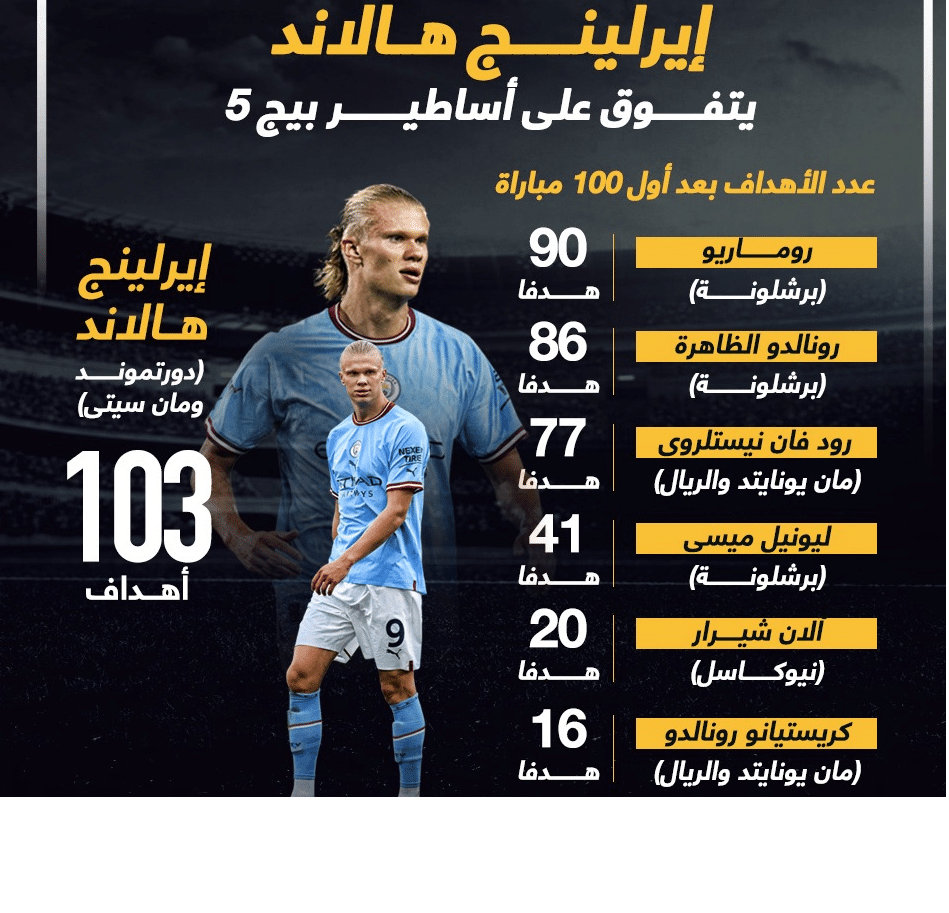 وإليكم 6 أساطير في "بيج 5"، تفوق عليهم هالاند بعد أول 100 مباراة كالأتي: