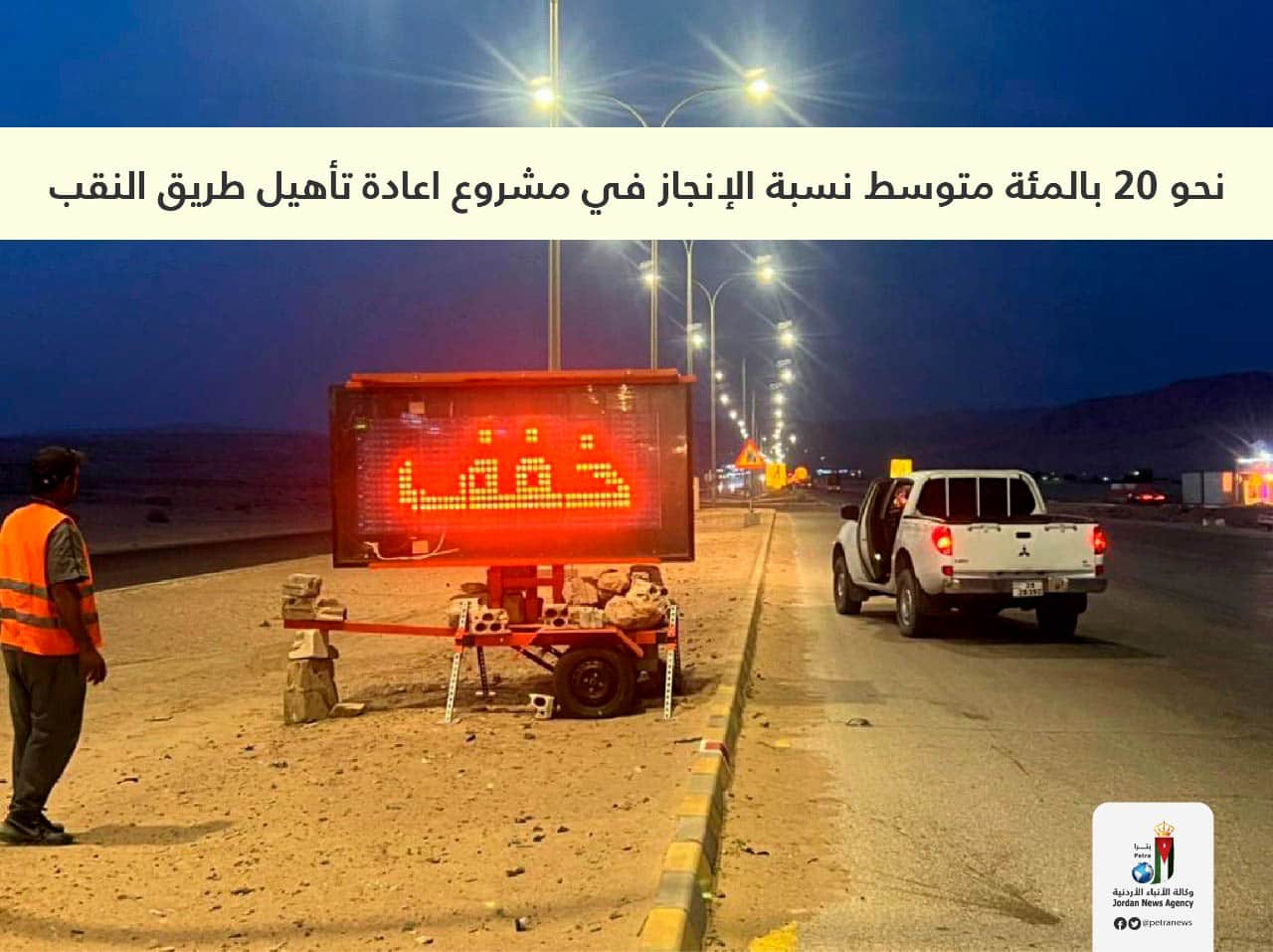 22 الاعلامي-(بترا) -مؤمن الحوري- أكدت وزارة الأشغال العامة والإسكان، أنه سيتم الانتهاء من الاعمال في مشروع اعادة تأهيل طريق النقب خلال الربع الثاني من العام المقبل.