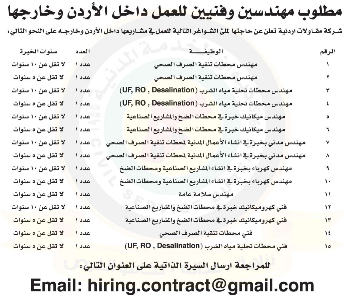 22 الاعلامي- اعلان عن توفر وظائف شاغرة مهندسين وفنيين للعمل لدى شركة مقاولات اردنية داخل الاردن وخارجها
