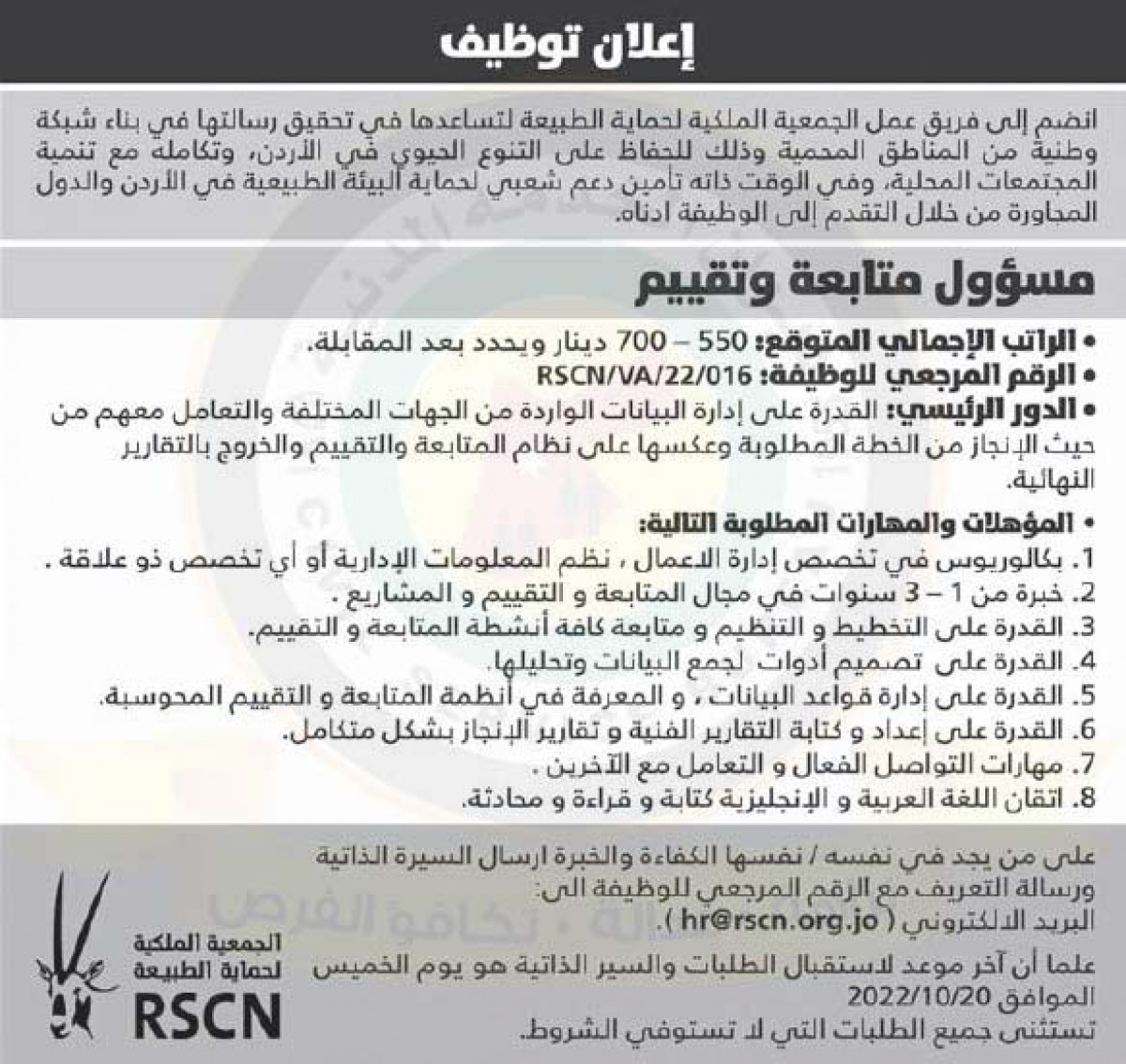 22 الاعلامي- اعلان توفر وظيفة شاغرة مسؤول متابعة وتقييم صادر عن الجمعية الملكية لحماية الطبيعة