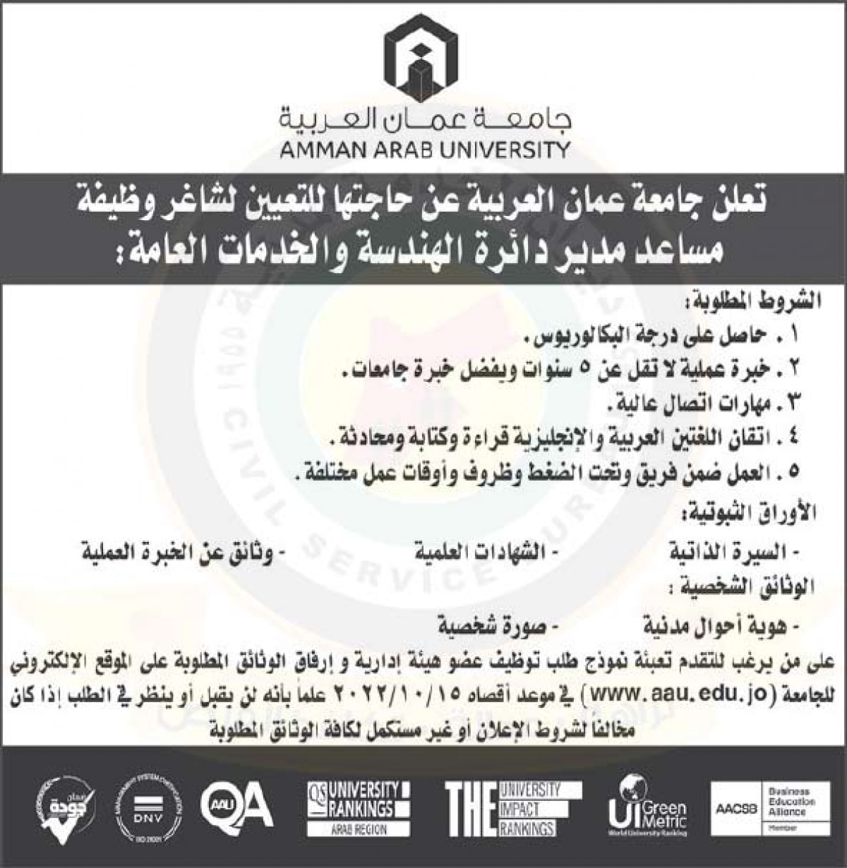 22 الاعلامي- اعلان توفر وظيفة شاغرة مساعد مدير دائرة الهندسة والخدمات العامة صادر عن جامعة عمان العربية