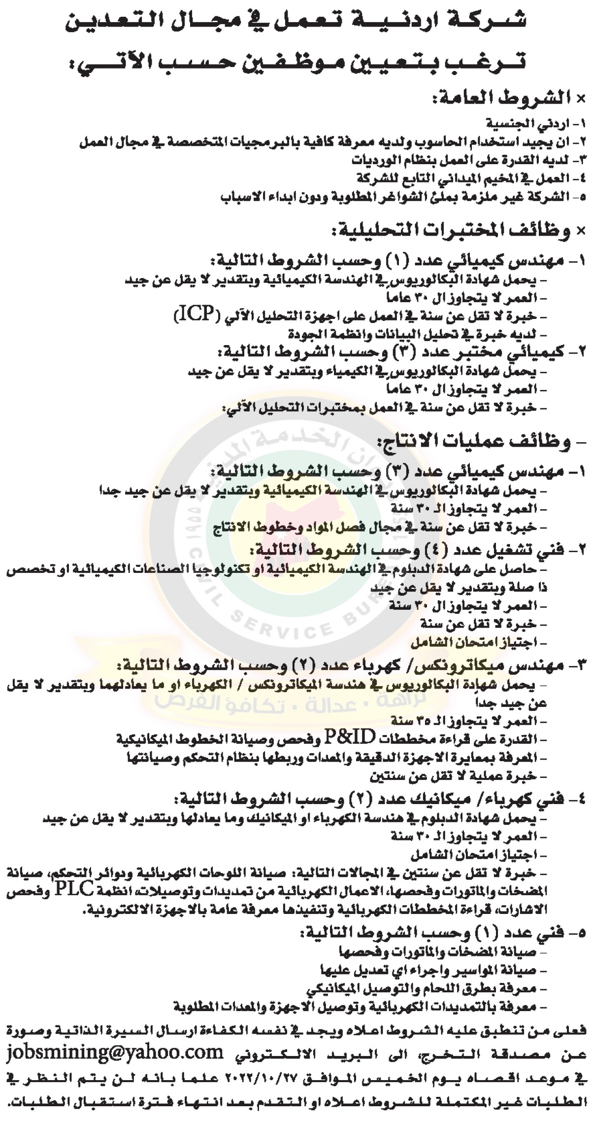 شركة اردنية تعمل في مجال التعدين ترغب بتعيين موظفين