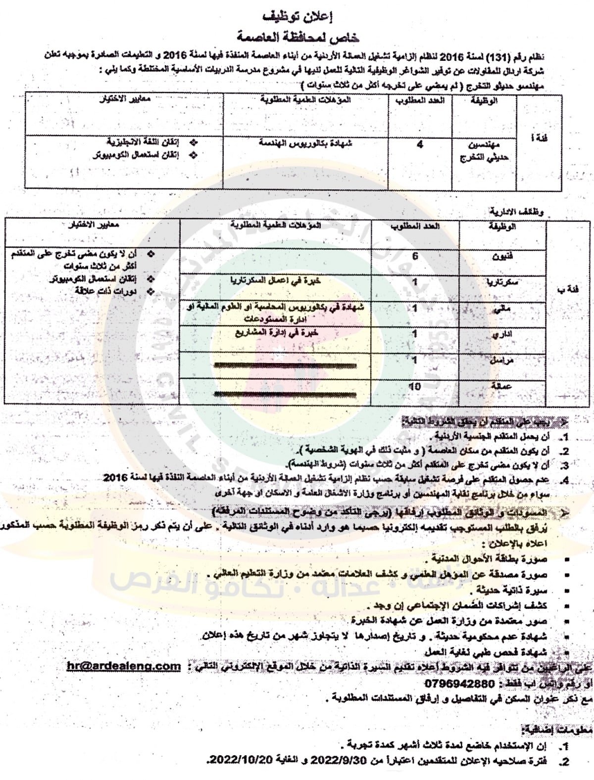 اعلان وظائف شاغرة صادر عن شركة اردال للمقاولات