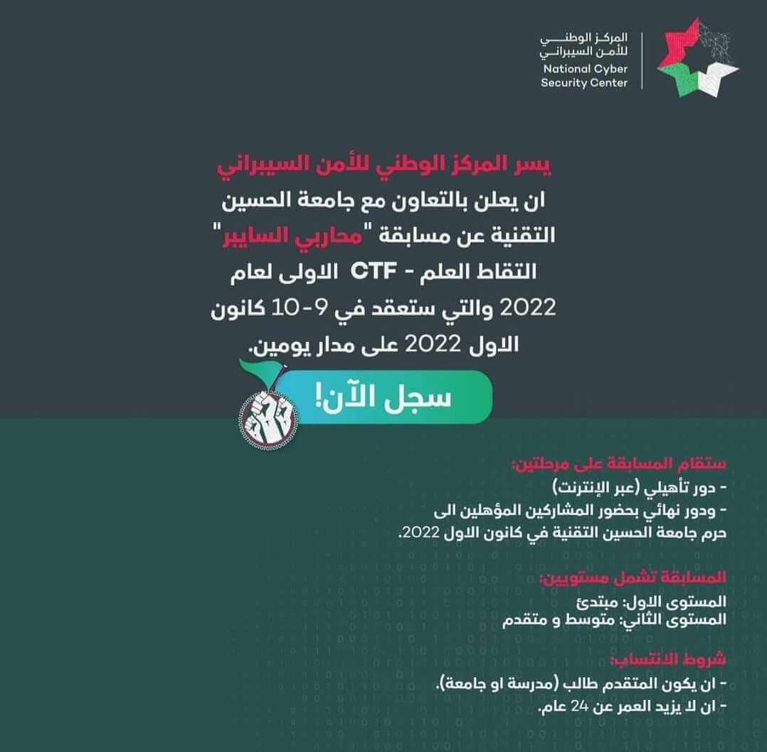 22 الاعلامي - أعلن المركز الوطني للأمن السيبراني بالتعاون مع جامعة الحسين التقنية عن فتح باب التسجيل في مسابقة "محاربي السايبر" التقاط العلم، وذلك تجسيداً لدور المركز في رفع القدرات في مجال الأمن السيبراني.