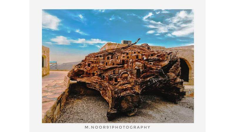 وأضاف أن المنحوتة أنجزها أبو زينة خلال فعاليات مخيم ضانا الإبداعي السابع، باستخدام أدوات نحت حديثة وقديمة، جسد فيها قرية ضانا بما تحويه من مبان قديمة وطرقات وغيرها من المرافق والمعالم السياحية في قرية ضانا التراثية.