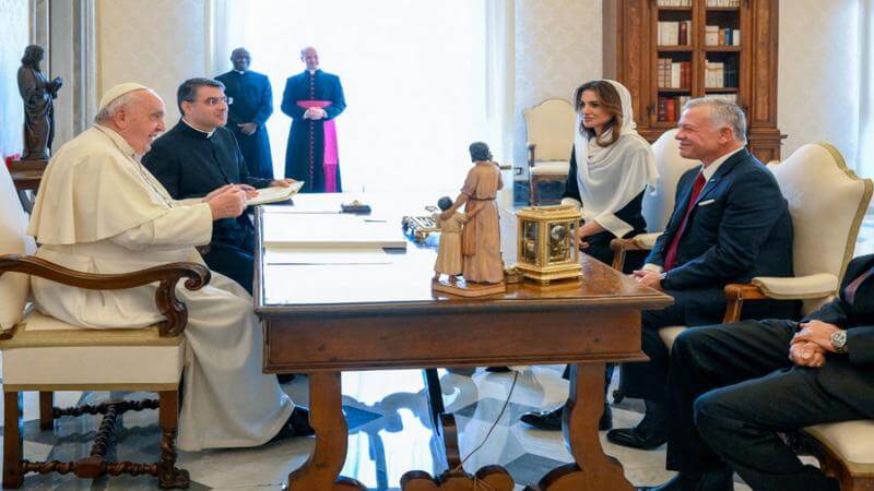 وأعرب جلالة الملك عن تقديره لمواقف قداسة البابا فرنسيس تجاه قضايا المنطقة.