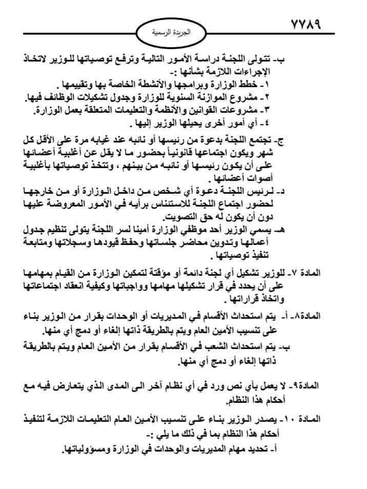 وللوزير تشكيل أية لجنة دائمة أو مؤقتة لتمكين الوزارة من القيام بمهامها على أن يحدد في قرار تشكيلها مهامها وواجباتها وكيفية انعقاد اجتماعاتها واتخاذ قراراتها.