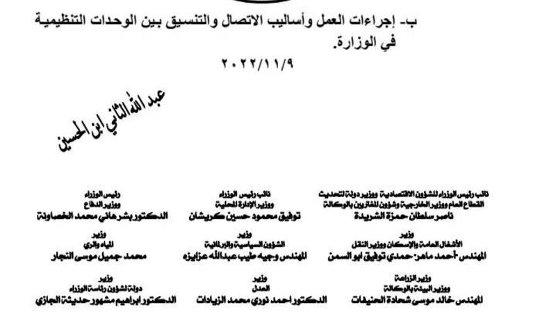 وبموجب النظام، يصدر الوزير بناء على تنسيب الأمين العام، التعليمات اللازمة لتنفيذ أحكام هذا النظام، بما في ذلك تحديد مهام المديريات والوحدات في الوزارة ومسؤولياتها، وإجراءات العمل وأساليب الاتصال والتنسيق بين الوحدات التنظيمية في الوزارة.