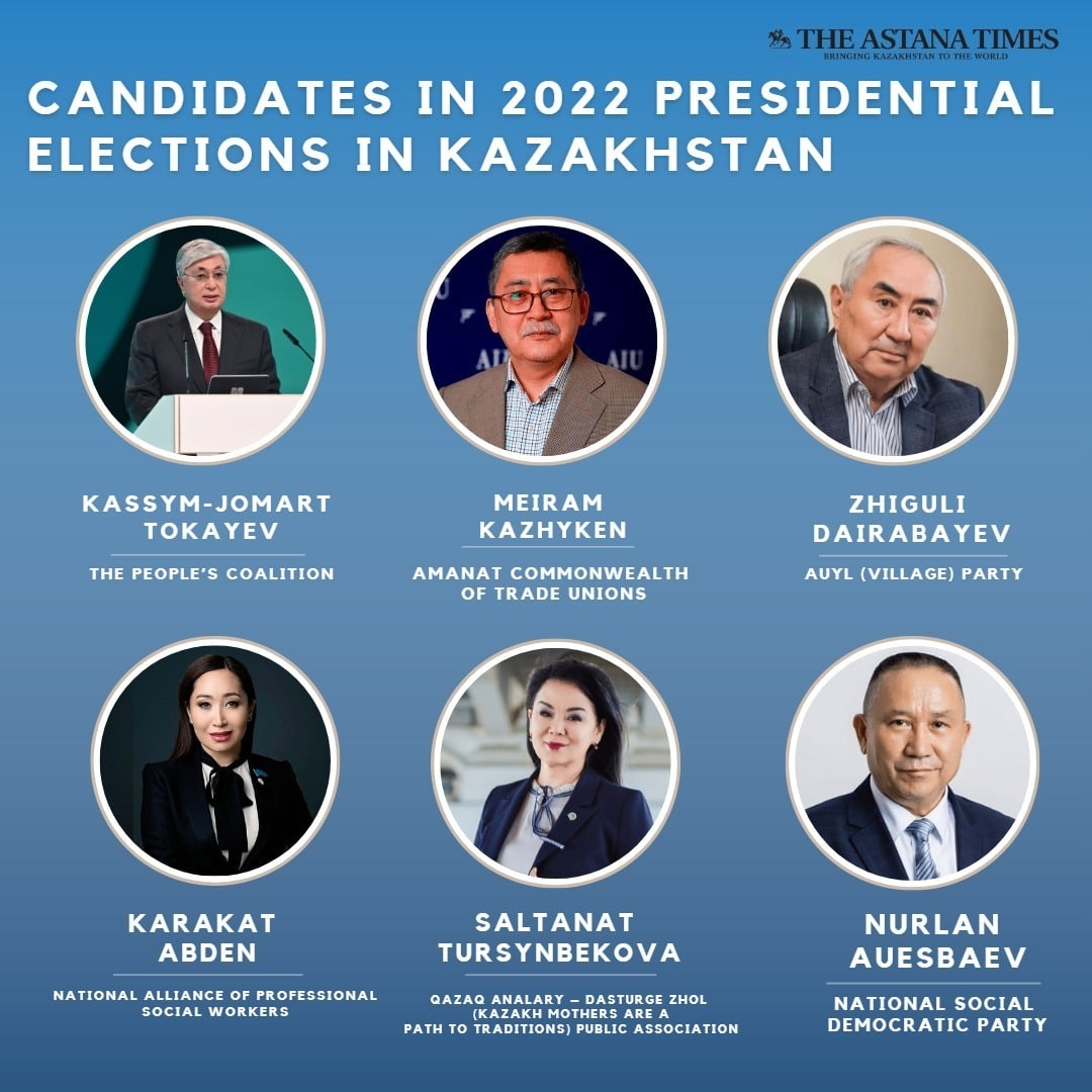 قاسم جومارت توقاييف الرئيس الحالي، وميرام كاجييكن، جيجولي دايراباييف، كاراكات أبدين، سلطانات تورسينبيكوفا، ونورلان أوسباييف.