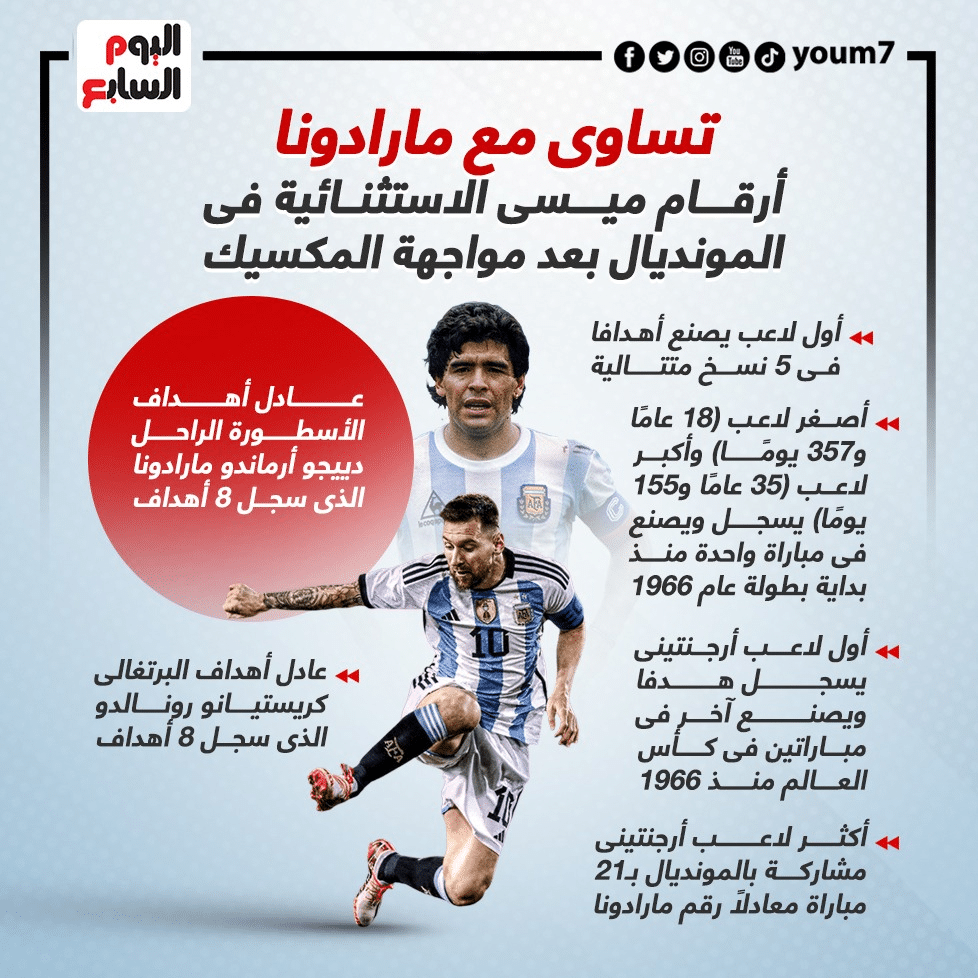 وحقق ليونيل ميسى، مهاجم منتخب الأرجنتين، العديد من الأرقام خلال مباراة منتخب بلاده أمام المكسيك، فى المباراة التي جمعت المنتخبين على ملعب "لوسيل"، ضمن منافسات الجولة الثانية من منافسات المجموعة الثالثة في بطولة كأس العالم 2022 .