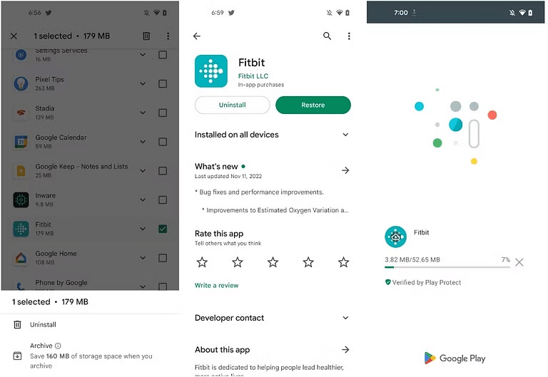 وفي حال إلغاء تثبيت تطبيق، وأرشفته عبر الميزة الجديدة من "جوجل"، فإنه عند العودة إلى قائمة متجر "بلاي"، ستجد أنه تم استبدال زر "التثبيت" Install بزر "الاستعادة" Restore.