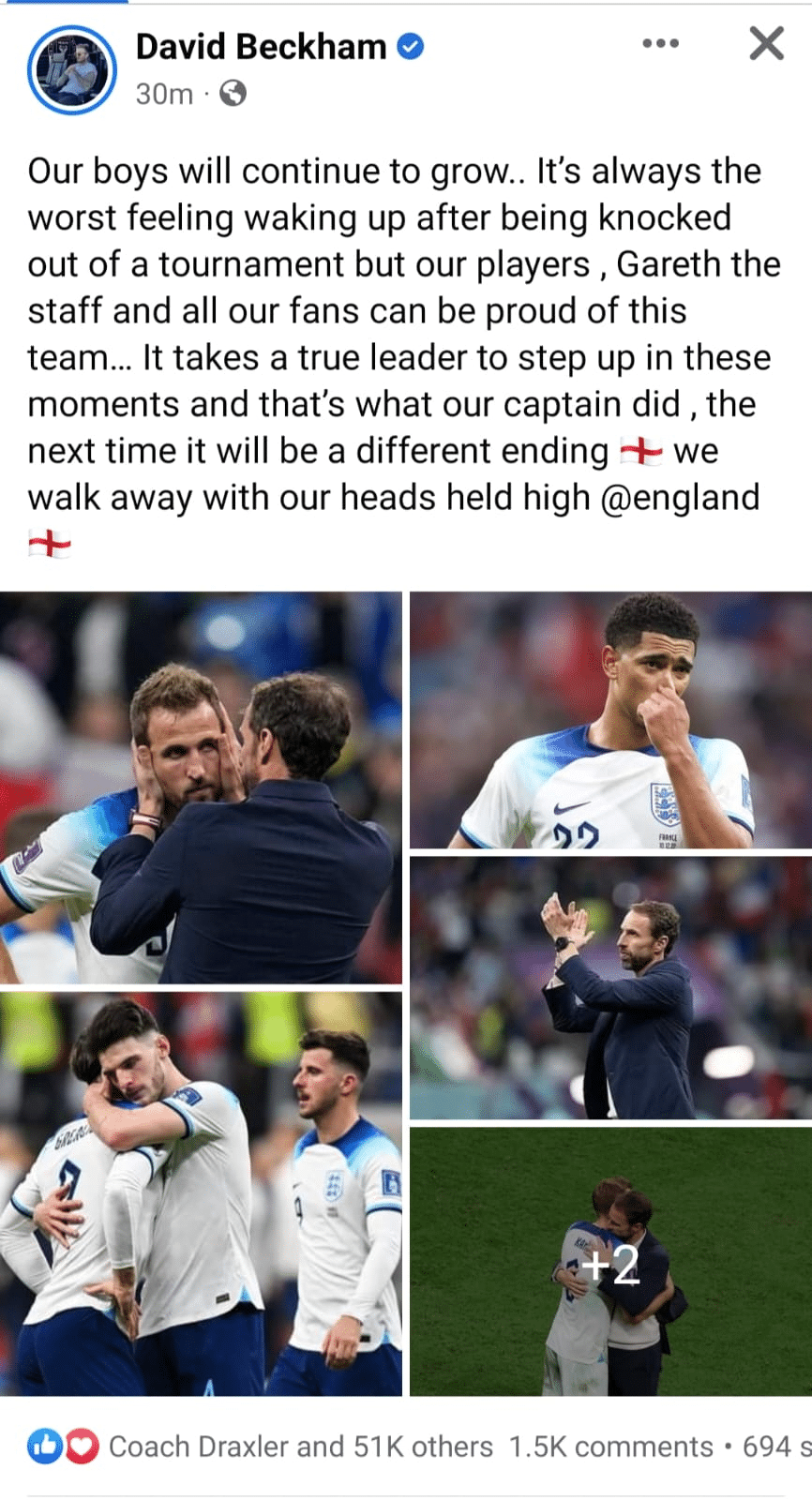 وكتب بيكهام عبر حسابه الشخصي على فيس بوك، "سيستمر أولادنا فى التقدم.. إنه دائمًا ما يكون أسوأ شعور بالاستيقاظ بعد خروجهم من البطولة، لكن، لاعبينا.. جاريث.. طاقم العمل وجميع جماهيرنا، يمكن أن يفخروا بهذا الفريق… يتطلب الأمر قائدًا حقيقيًا ليصعد في هذه البطولة، وهذا ما فعله قائدنا ، في المرة القادمة ستكون نهاية مختلفة نسير بعيدًا ورؤوسنا مرفوعة عالياً.. إنجلترا".