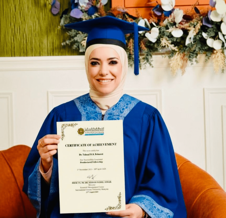 الدكتورة تهاني رفعت بشارات تحصل على زمالة ما بعد الدكتوراه من الجامعة الإسلامية العالمية – ماليزيا
