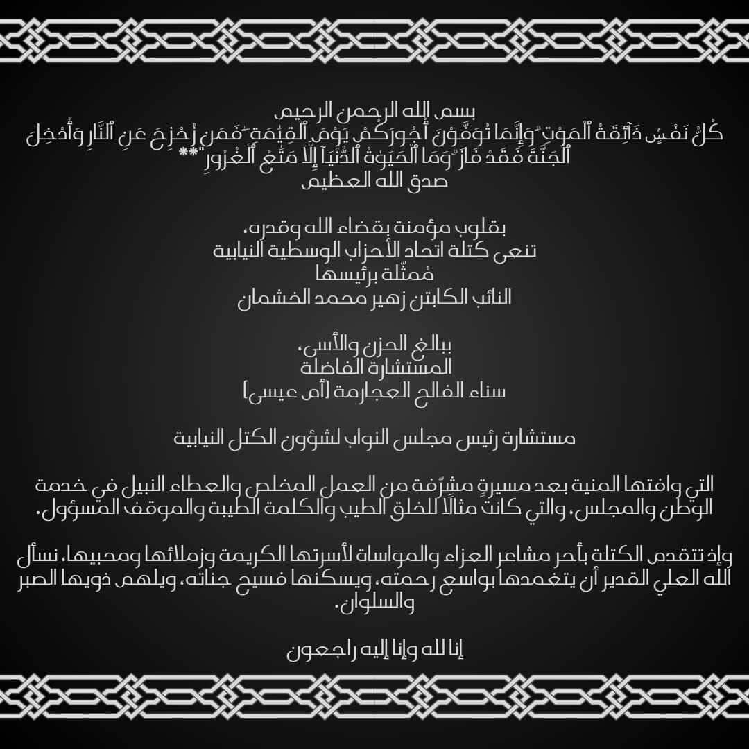 كتلة اتحاد الأحزاب الوسطية النيابية تنعى سناء الفالح العجارمة