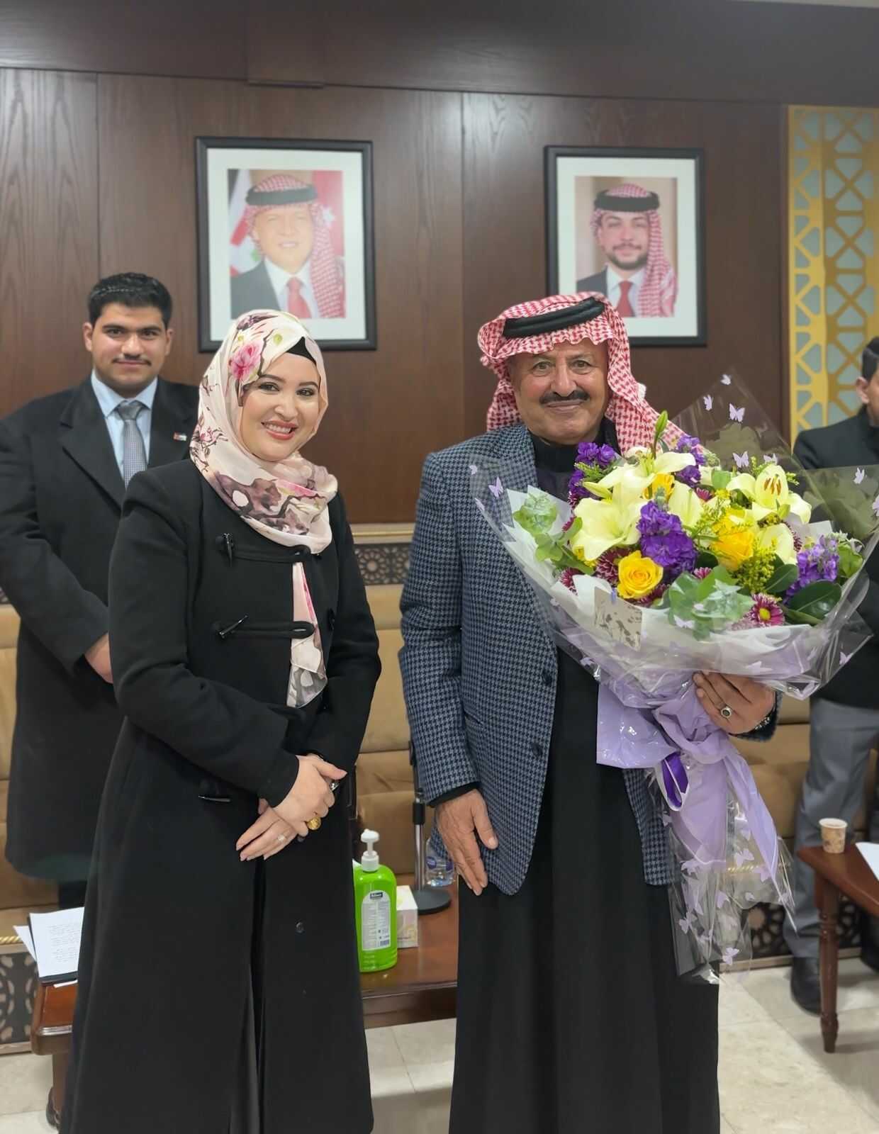 المستثمرة ياسمين عياد تهدي الباشا كنيعان البلوي باقة ورد خلال لقائهما