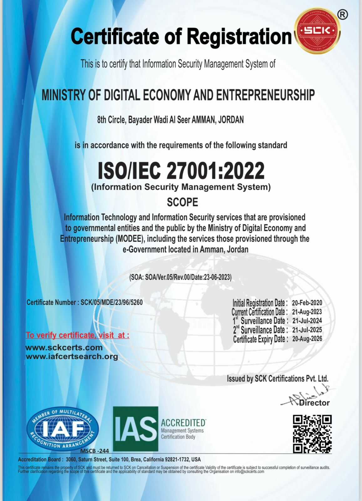 الاقتصاد الرقمي والريادة تحصل على شهادة الأيزو الدولية 27001:2022 لإدارة أمن المعلومات