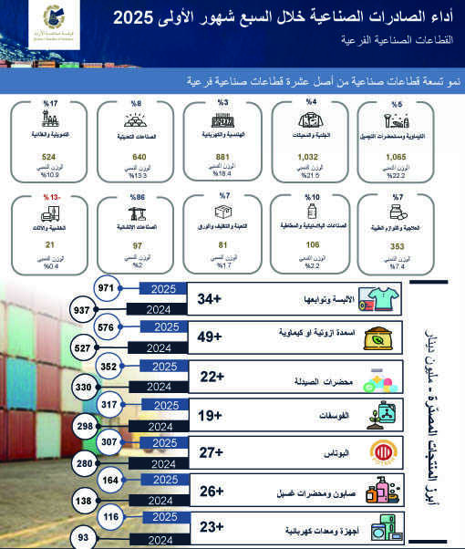 صادرات القطاع الصناعي تنمو 6.6 % خلال 7 أشهر