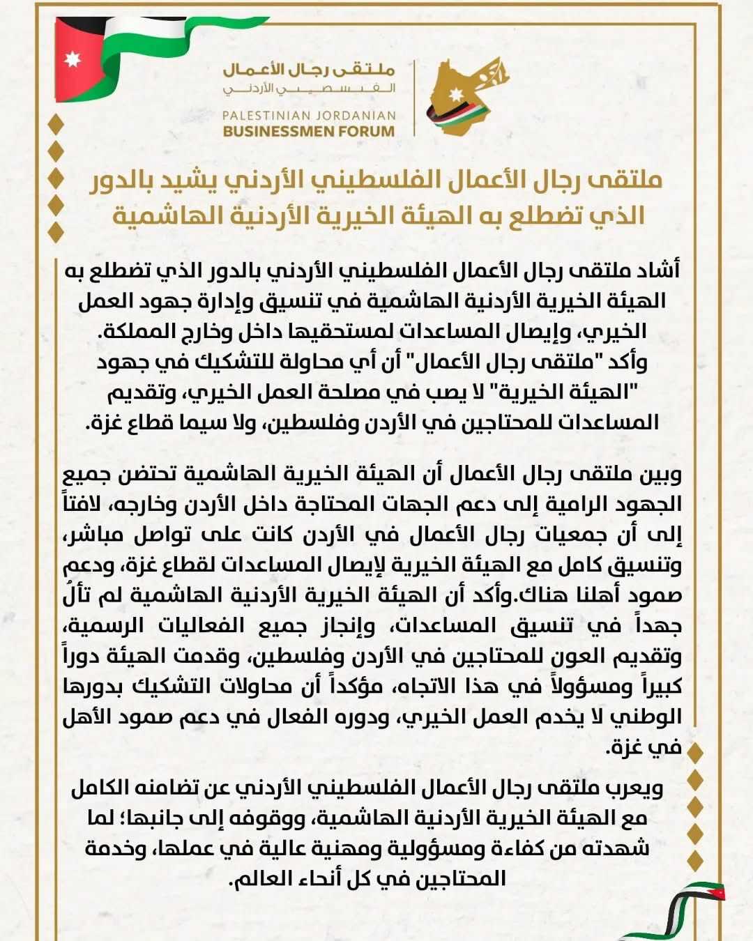 ملتقى رجال الأعمال الفلسطيني الأردني يشيد بالدور الذي تضطلع به الهيئة الخيرية الأردنية الهاشمية