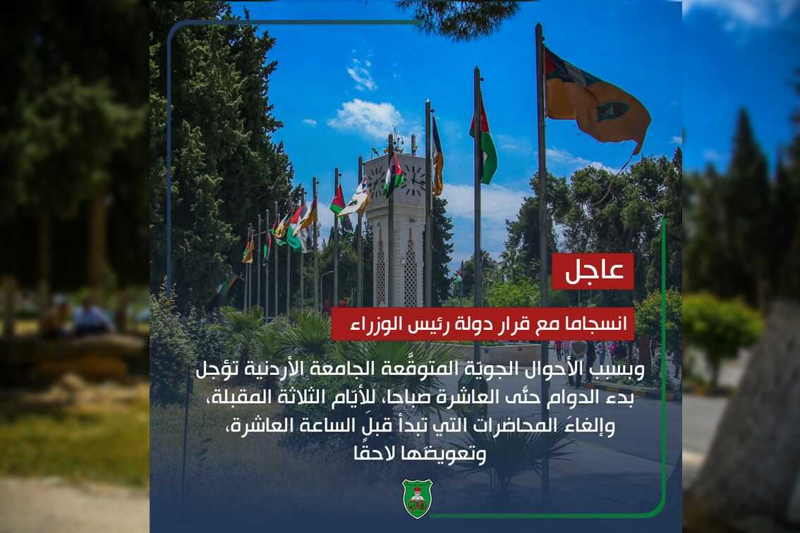 الجامعة الأردنية تؤجل بدء الدوام حتّى العاشرة صباحًا، للأيّام الثلاثة المقبلة بسبب الأحوال الجويّة المتوقَّعة .. تفاصيل