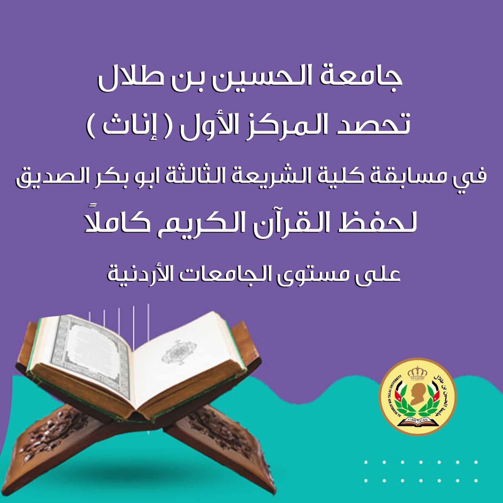 الحسين بن طلال تحصد المركز الأول في مسابقة كلية الشريعة الثالثة ”ابو بكر الصديق” لحفظ القرآن الكريم كاملاً على مستوى الجامعات الأردنية.
