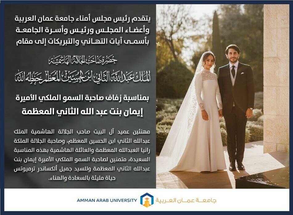 جامعة عمان العربية تهنئ بمناسبة زفاف صاحبة السمو الملكي الأميرة إيمان بنت عبدالله
