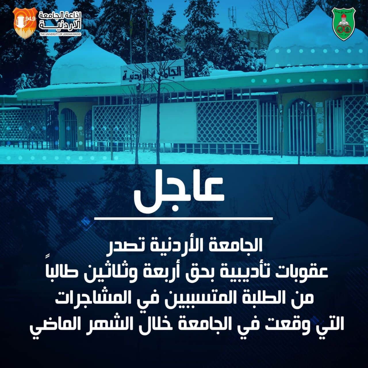 الجامعة الأردنية تصدر عقوبات تأديبية بحق أربعة وثلاثين طالباً