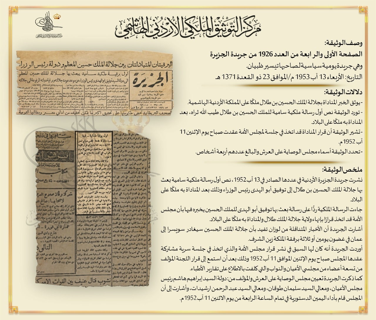 التوثيق الملكي ينشر وثيقة المناداة بالحسين ملكاً