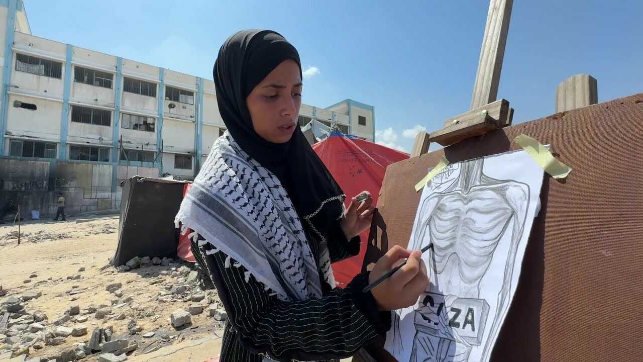 بالفيديو .. فنانة تشكيلية تستخدم الرماد لرسم لوحات تجسّد الجوع والفقر والدمار
