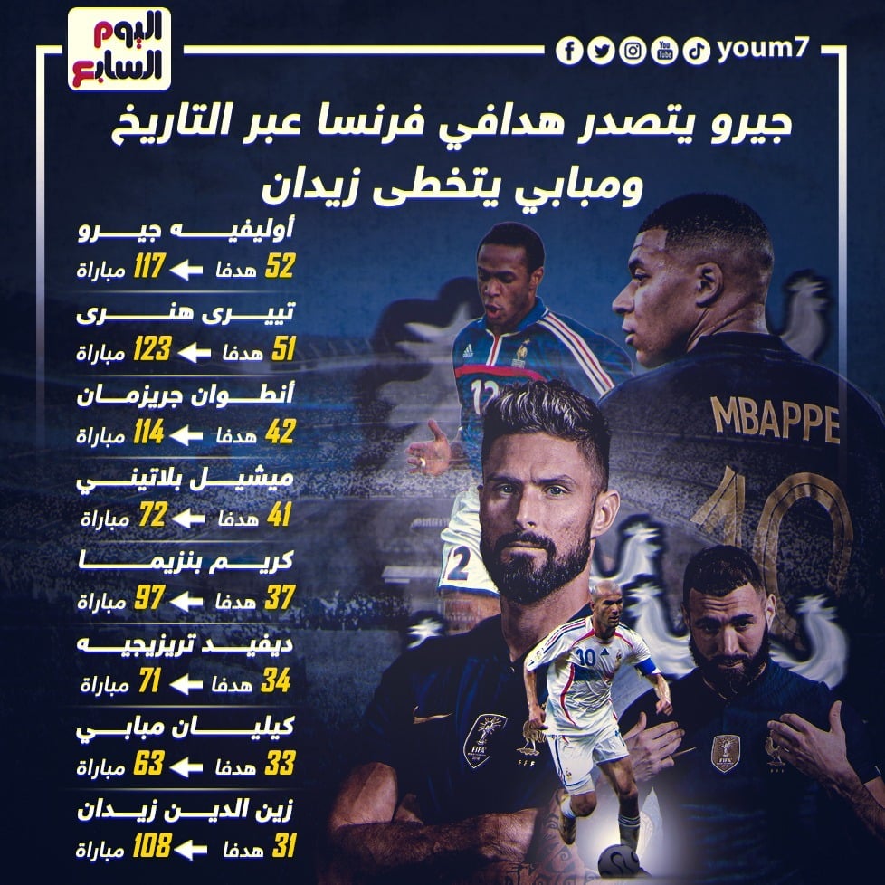 جيرو يتصدر هدافي فرنسا عبر التاريخ ومبابي يتخطى زيدان.. إنفو جراف
