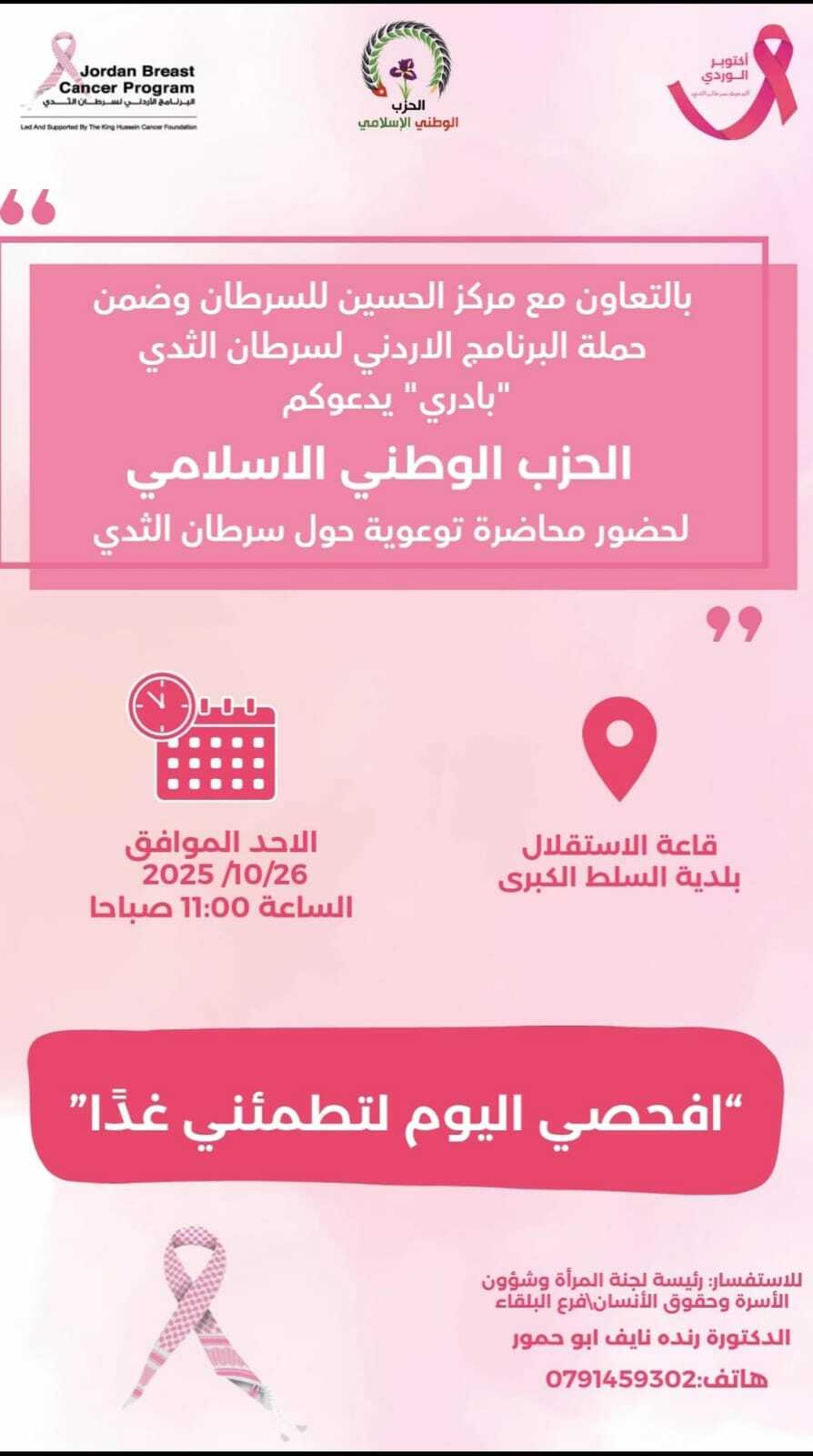 الحزب الوطني الإسلامي يدعو لحضور محاضرة توعوية حول سرطان الثدي بالتعاون مع مركز الحسين للسرطان