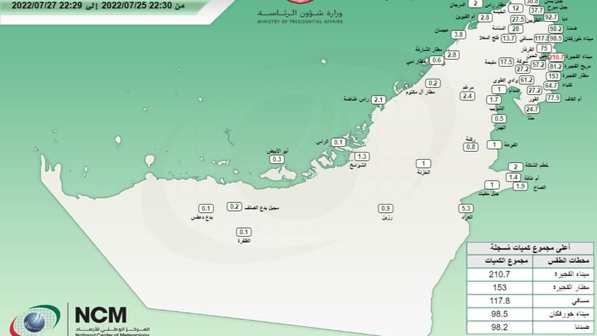 الإمارات | ارتفاع كمية الأمطار إلى أكثر من 210ملم في بعض المناطق الشرقية قبل قليل