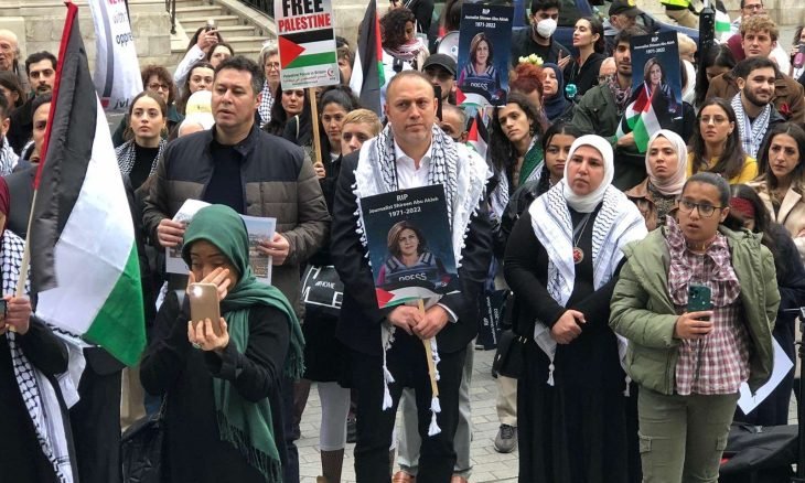 المئات من الصحافيين والمتضامنين يعتصمون في لندن تنديداً باستشهاد أبو عاقلة