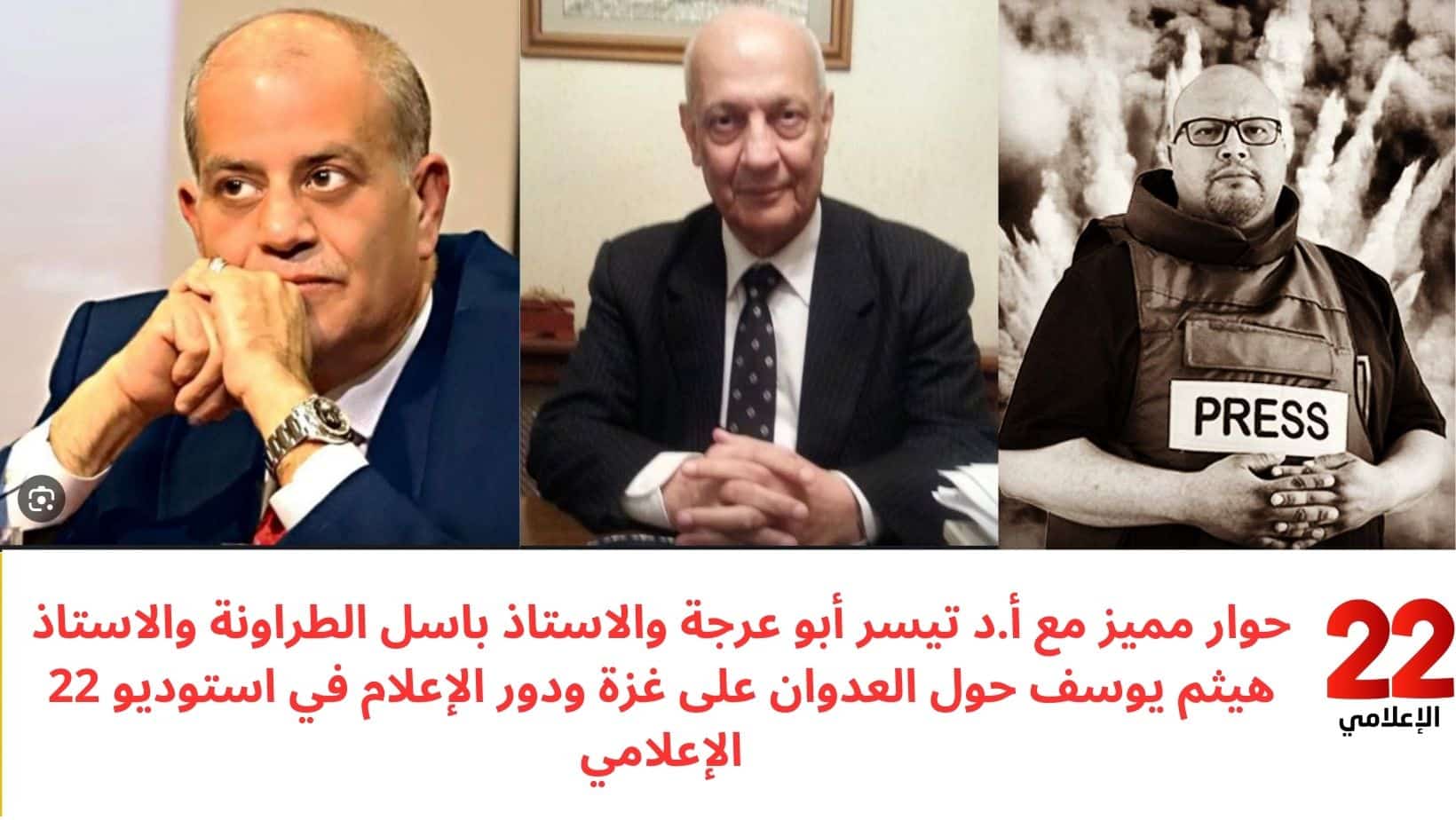 بالفـيـديـو .. حوار مميز مع أ.د تيسر أبو عرجة والاستاذ باسل الطراونة والاستاذ هيثم يوسف حول العدوان على غزة ودور الإعلام في استوديو 22 الإعلامي