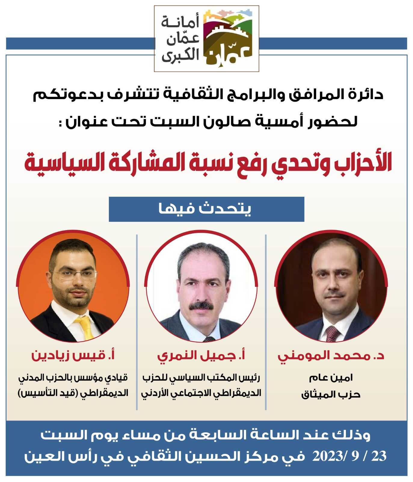 المومني والنمري وزيادين بصالون السبت بالأمانة غدا