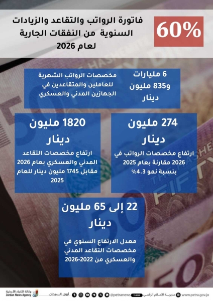 فاتورة الرواتب والتقاعد والزيادات السنوية تشكل 60% من النفقات الجارية لعام 2026