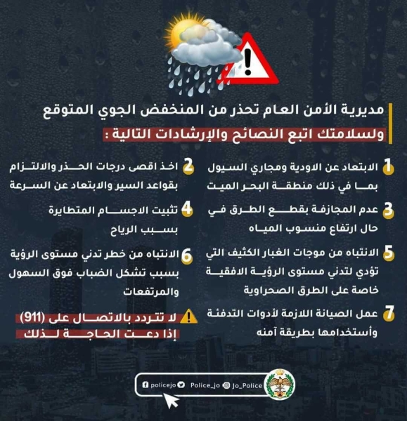 الأمن العام يحذر من المنخفض الجوي المتوقع في اليومين القادمين