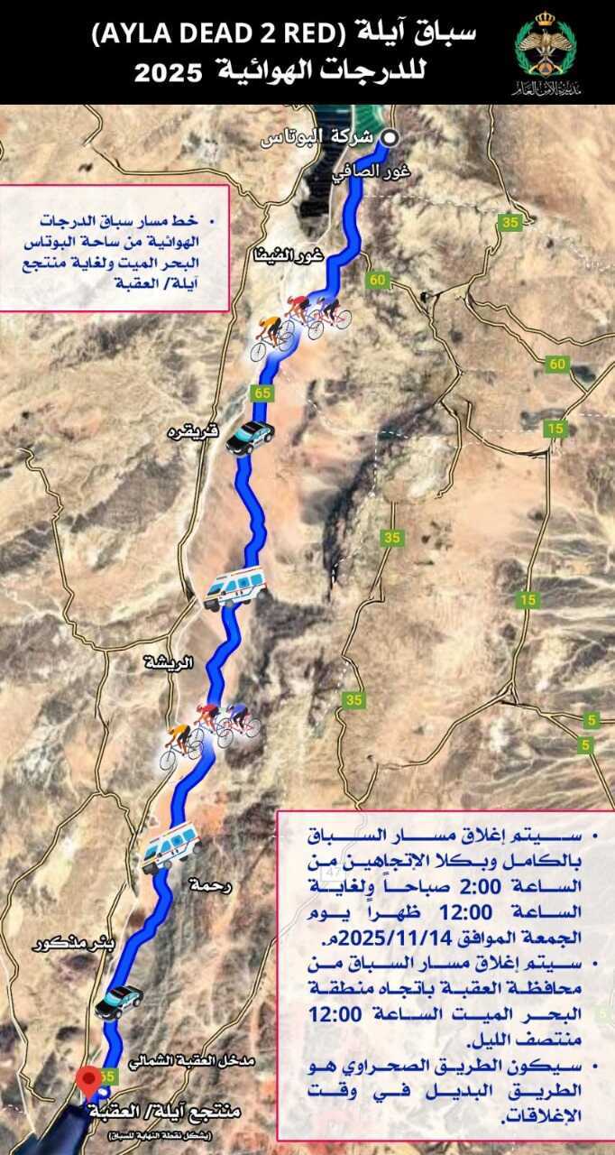 الأمن العام يعلن إغلاق مسار سباق آيلة للدراجات الهوائية يوم الجمعة المقبل
