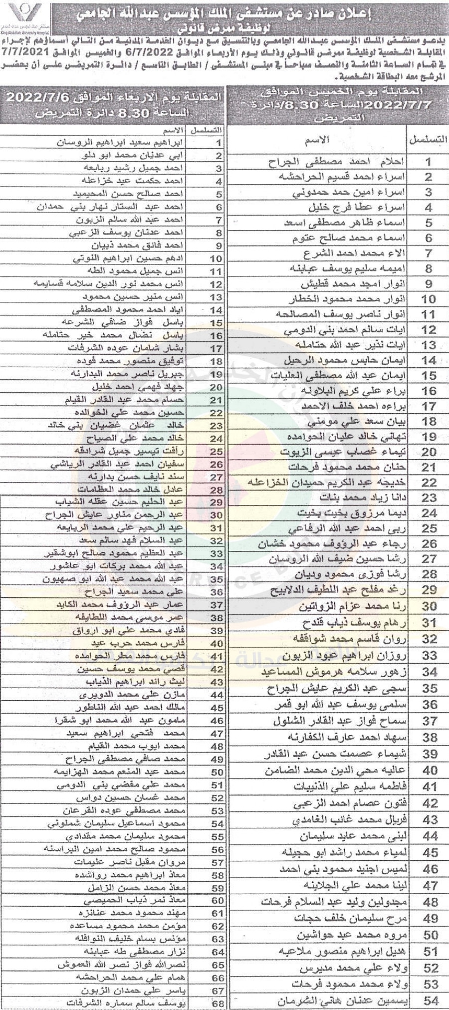 اعلان عن موعد اجراء المقابلات الشخصية صادر عن مستشفى الملك المؤسس عبد الله الجامعي وبالتنسيق مع ديوان الخدمة المدنية