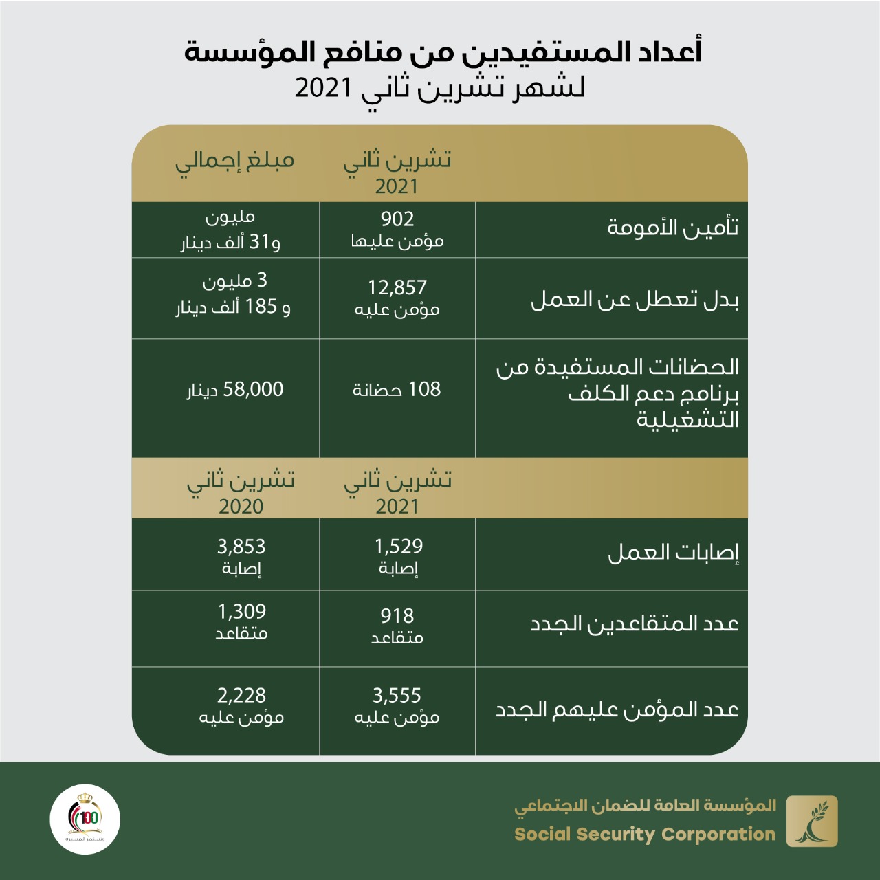 الضمان يكشف عن أعداد المُستفيدين من منافعه التأمينية لشهر تشرين ثاني2021
