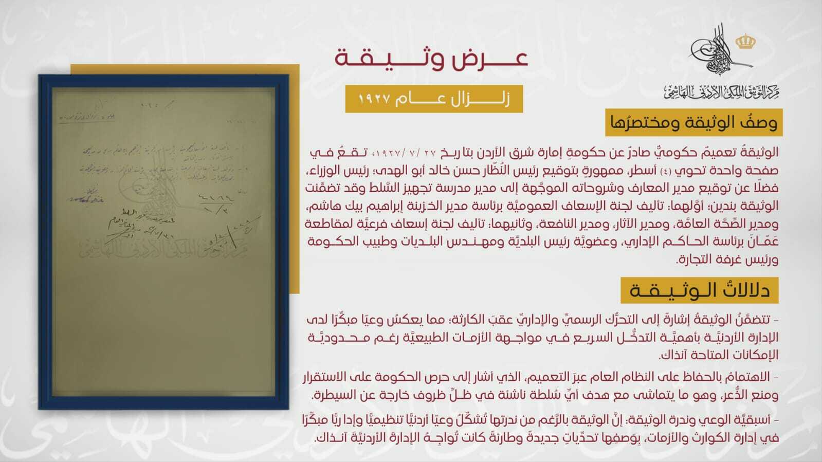 التوثيق الملكي يعرض وثيقة حول "زلزال نابلس"