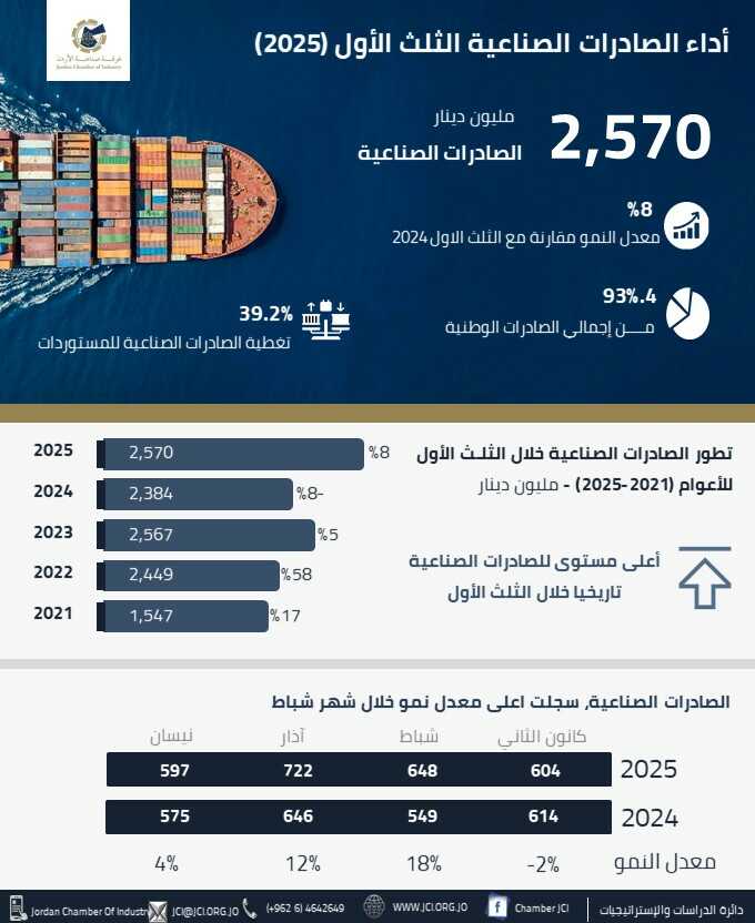 صادرات الصناعة تنمو 8 % بالثلث الأول من العام
